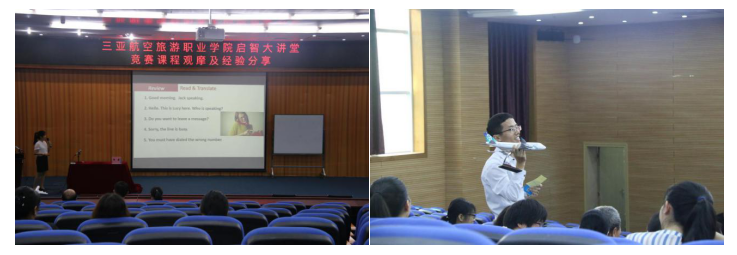 本次系列活动第二场讲座由本届海南省普通高等学校青年教师教学大赛高职组我校获奖教师顾振华及任丹老师主讲。两位老师为大家上了一堂精彩的观摩课。顾振华老师的充分利用蓝墨云、Focusky动画演示等现代信息技术与教学相结合,其教学观念新颖,设计构思精巧,教学手段丰富。任丹老师课堂流畅,能充分调动学生的积极性,整个课堂氛围轻松愉快,教师语音地道纯正,语貌语态非常有感染力,有极强的课堂把控能力,将一堂公共基础课生动又高效地传授给大家。两位老师充分展示了其扎实的专业功底和丰富的教学经验。