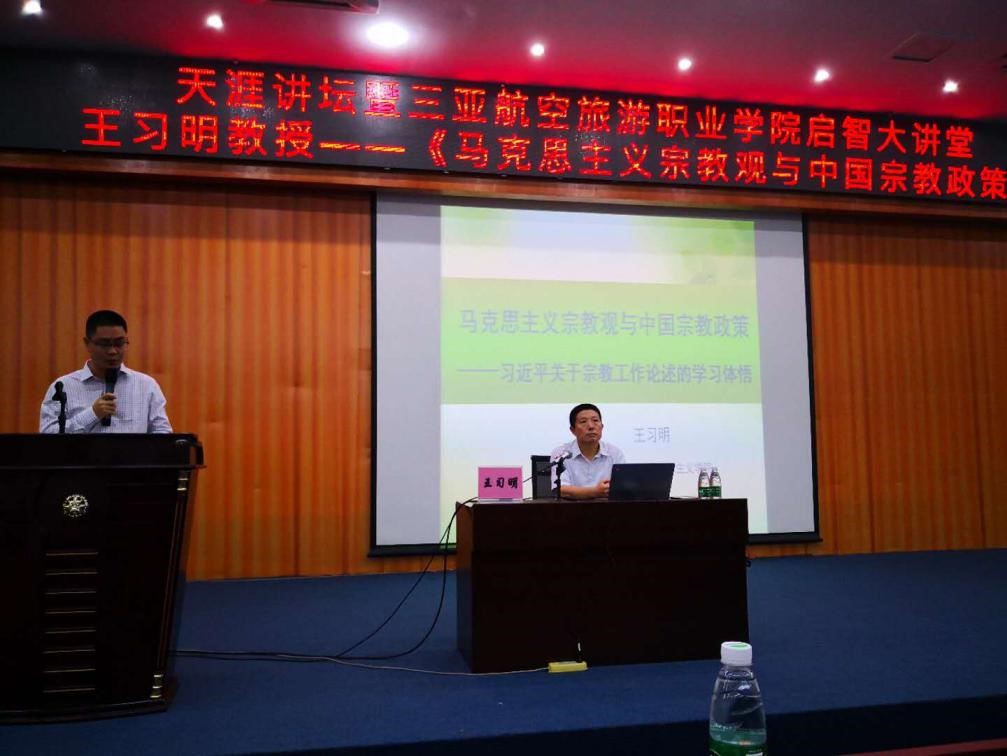 王习明教授系海南师范大学博士生导师、国家百千万人才和有突出贡献中青年专家、国务院特贴专家、海南省首届杰出人才。王教授从马克思主义宗教观入手,深刻地分析了“宗教的起源与本质”、“宗教的存在与消亡”及“我国宗教的发展情况”、“我国的宗教政策”等问题,并且结合海南省宗教概况及存在的问题进行了深入剖析。