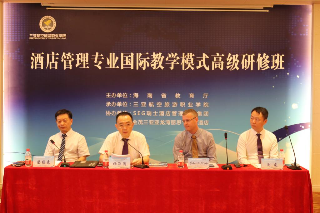 John Daly用富有激情的语言、表情和丰富的肢体动作,为大家分享了瑞士款待业的发展及现状,SEG的教育理念、教学模式,未来产教融合的模式以及激发学生积极性的方法。周龙先生祖籍湖南,旅居瑞士10年,他结合自己对中西方教育和文化的理解,以及自身求学、创业、以及多年海外教育教学的经验,用比较的方法和生动的案例,为大家分享了国际酒店业现状及面临的挑战,国际旅游与款待业的最新趋势,未来旅游业的发展方向,未来酒店和旅游院校的发展趋势以及SEG的人才培养模式和实训教学体系。杨结先生围绕中国旅游与酒店行业及专业人才培养模式的发展、变革及未来方向做了精彩的报告。培训期间,还前往三亚金茂丽思卡尔顿酒店进行了现场学习与交流。