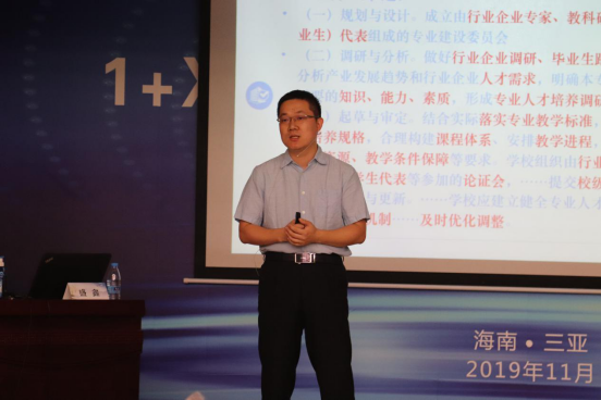 海南省教育厅高教处副处长苏永光参加了本期研修班开班典礼。他指出,《国家职业教育改革实施方案》的颁布,一方面,吹响了职业教育深化改革、提质升级的集结号,另一方面,明确职业教育与普通教育是两种不同教育类型,具有同等重要地位,甚至将职业教育的重要性提高到了“没有职业教育现代化就没有教育现代化”的新的历史高度。1+X证书制度是党中央国务院对职业教育改革做出的重要部署,是落实立德树人根本任务、完善职业教育和培训体系、深化产教融合校企合作、构建中国特色职教发展模式的一项重大制度设计创新。1+X证书制度的实施,必将助推职业院校教学改革走向深入。