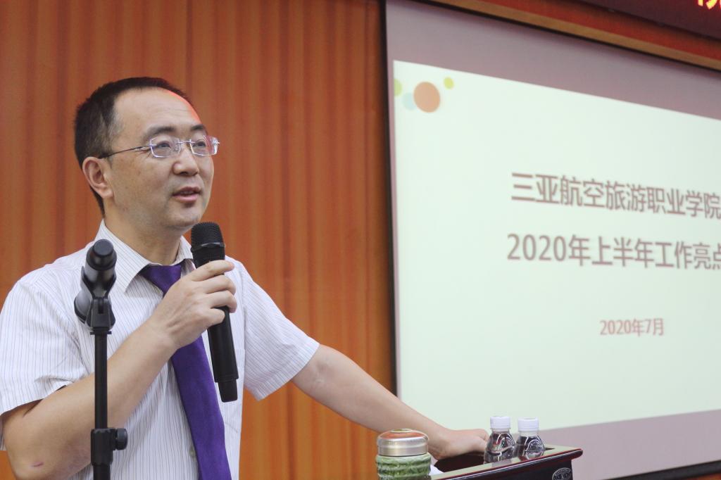 本次教职工大会,首先通报了2019-2020学年第二学期各类教育教学成果。随后,党委书记、董事长兼校长杨涵涛做了2020年上半年工作报告,杨校长结合国际国内形势、分析学校发展面临的重大机遇,传达了集团会议部署精神,并通报了2020年上半年工作亮点。2020年上半年,我校获批CCAR-147飞机维修培训资质(海南唯一高校),并被中国民航局选定为全国在校生飞机维修执照改革试点培训的7家院校之一(海南唯一高校);《“双师”教师队伍建设经验》案例入选教育部首批全国职业院校“双师型”教师队伍建设典型案例,全省共2所高职院校案例入选;与海航航空技术有限公司联合申报的“海航技术航空一站式飞机维修及培养团队”,入选海南省“双百”人才团队;获批海南省退役军人就业创业培训基地,海南省仅2所高校获此殊荣;做好防疫工作,坚持“停课不停学”,保障学生安全返校,确保学校一方净土。会上,杨校长还结合工作实际,分享了工作方法、工作思维,并布置了暑期工作。