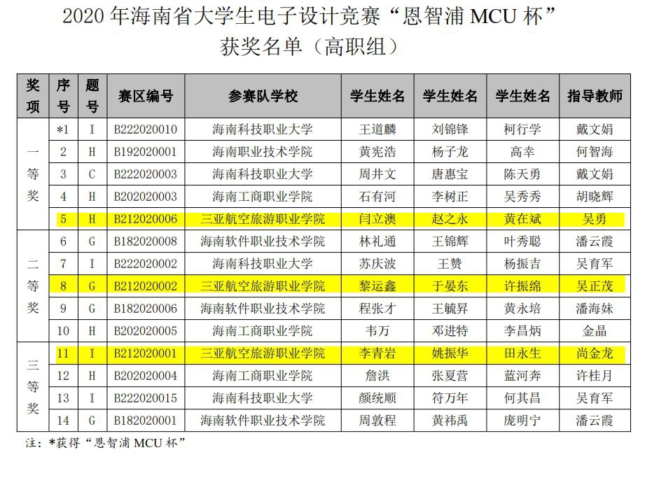 由海南省教育厅主办的2020海南省大学生电子设计竞赛“恩智浦MCU杯”于近期落下帷幕,经过激烈的角逐,我校的3组参赛选手分别取得了高职组省级一等奖、二等奖和三等奖的佳绩。