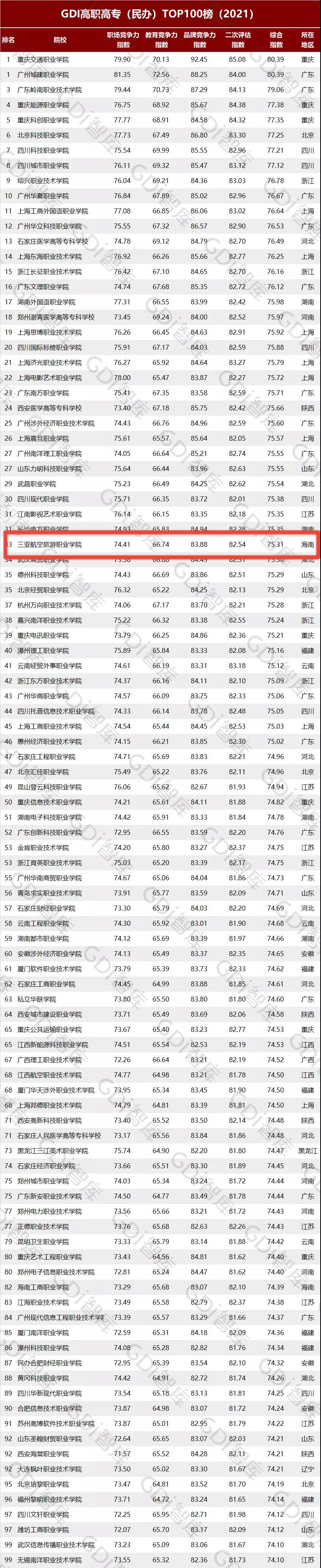 2021年4月21日,最新GDI高职高专(民办)TOP100榜(2021)发布,AWC万象城娱乐排名全国第33位,海南省第1名!