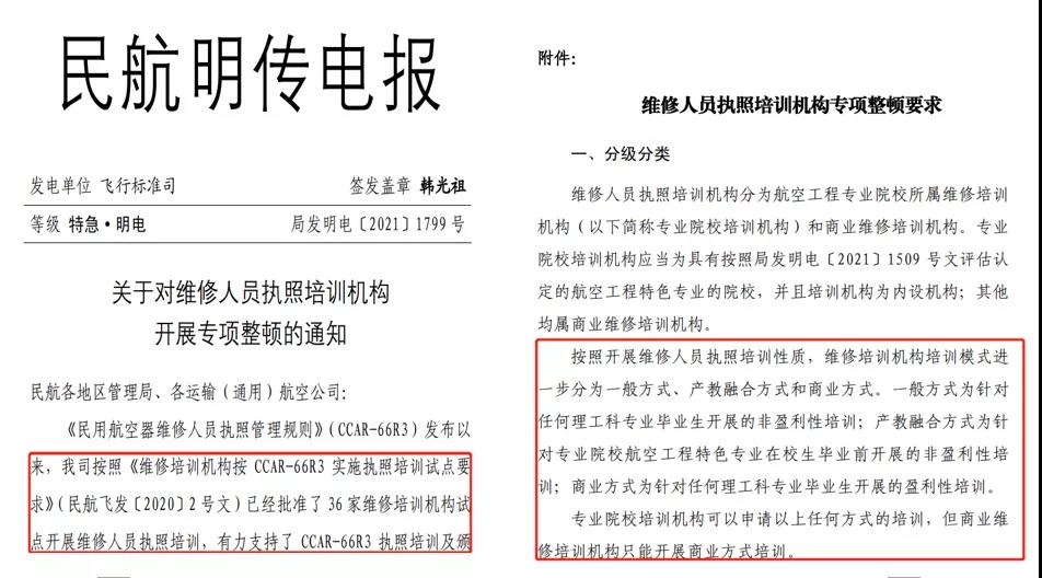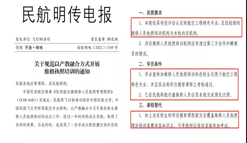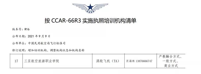 2020年5月22日CCAR-66R3《民用航空器维修人员执照管理规则》已由中华人民共和国交通运输部颁布,自2020年7月1日起施行,我校是首批七所在校生147执照培训试点院校之一。2021 年 9 月 9 日,局方发布了最新CCAR-66R3实施执照培训机构清单,明确了可开班的方式。其中,产教融合方式、一般方式、商业方式等3种模式都具备的共8家,我校是其中之一。