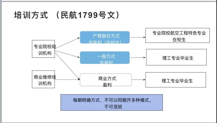 3种模式分别为:1.一般方式为针对任何理工科专业毕业生开展的非盈利性培训;2.产教融合方式为针对专业院校航空工程特色专业在校生毕业前开展的非盈利性培训;3.商业方式为针对任何理工科专业毕业生开展的盈利性培训。