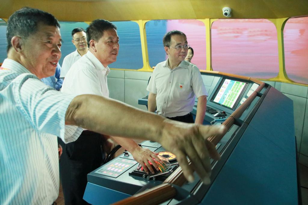 签约前,杨涵涛校长、梁维意副校长等陪同刘智峰副部长和洋浦技工学校客人一行先后参观了学校实训楼航海科技馆、轮机模拟器、360°航海模拟舱、航空实训楼汉莎培训中心和乘务训练中心。