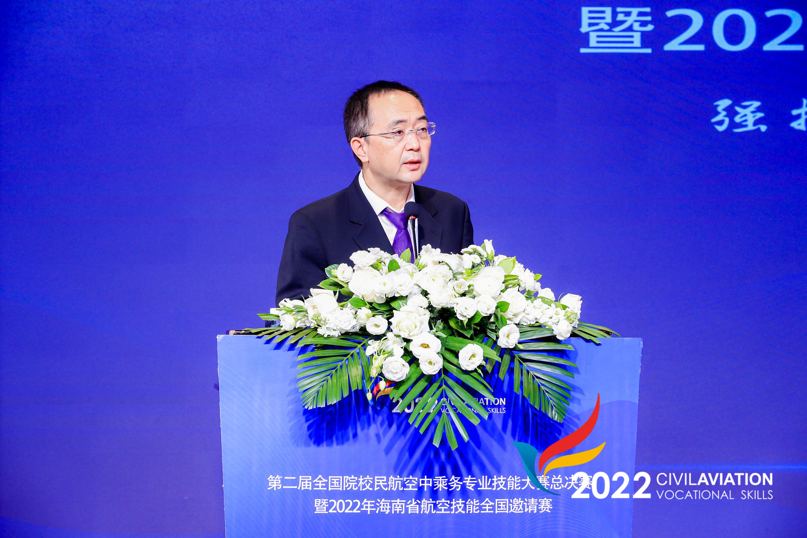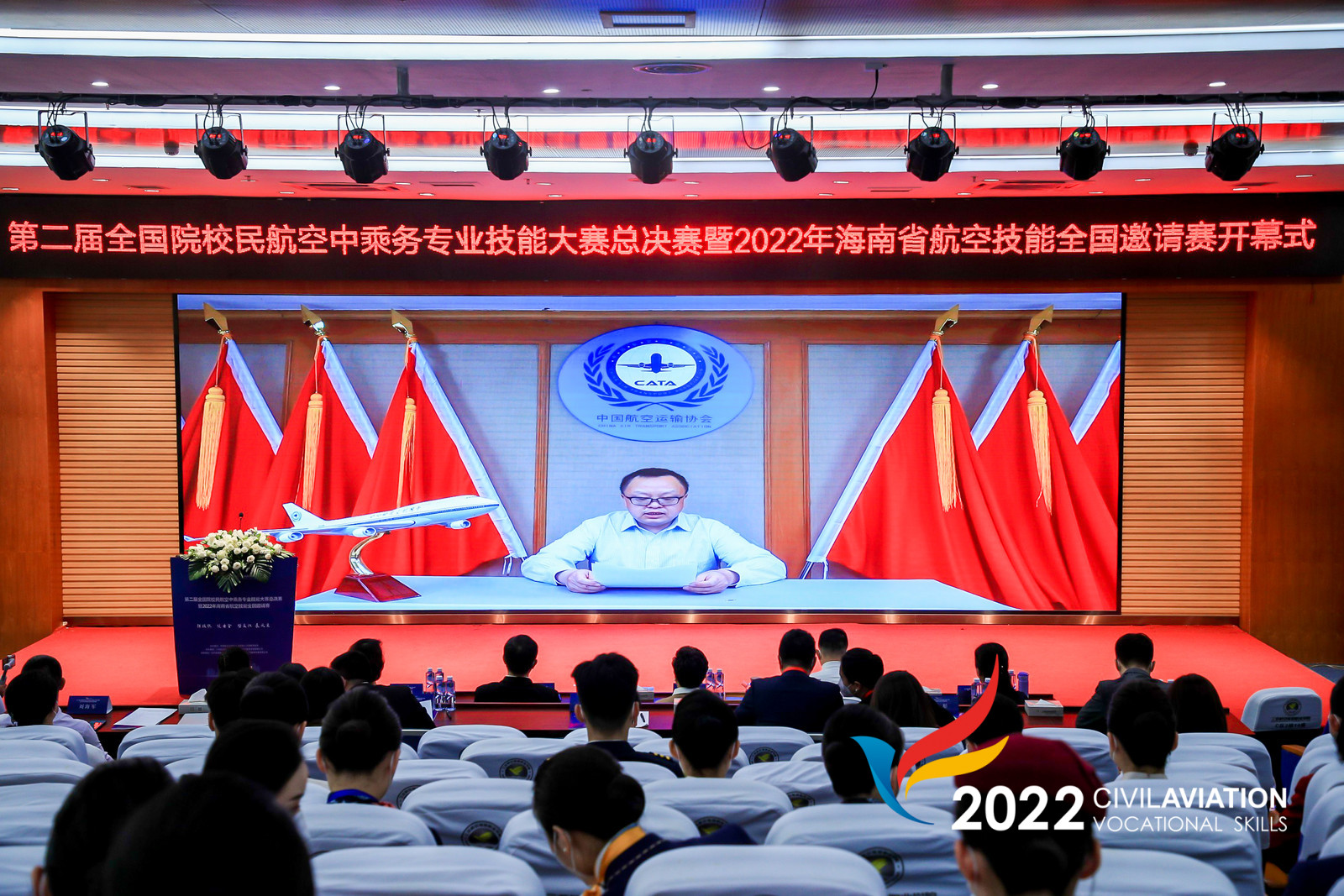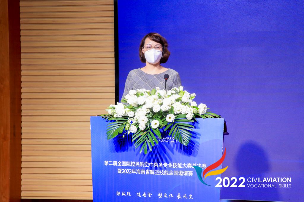 随后,中国航空运输协会常务副理事长潘亿新发来视频祝贺大赛开幕。潘亿新常务副理事长首先代表中国航空运输协会对中国民用航空局、海南省的大力支持表示感谢,对组织此次大赛的AWC万象城娱乐、支持单位、比赛承办单位以及各位工作人员的辛勤付出表示诚挚的谢意,对各位领导、专家、裁判以及参赛队伍的到来表示热烈欢迎和诚挚的问候。潘亿新常务副理事长表示“十四五”时期我国民航将进入发展质量的提升期,本届大赛的举办是中国航空运输协会落实二十大精神的具体行动,是对职业院校空中乘务专业训练的一次检阅。最后他预祝所有选手都能收获满满,预祝此次大赛能够圆满成功。