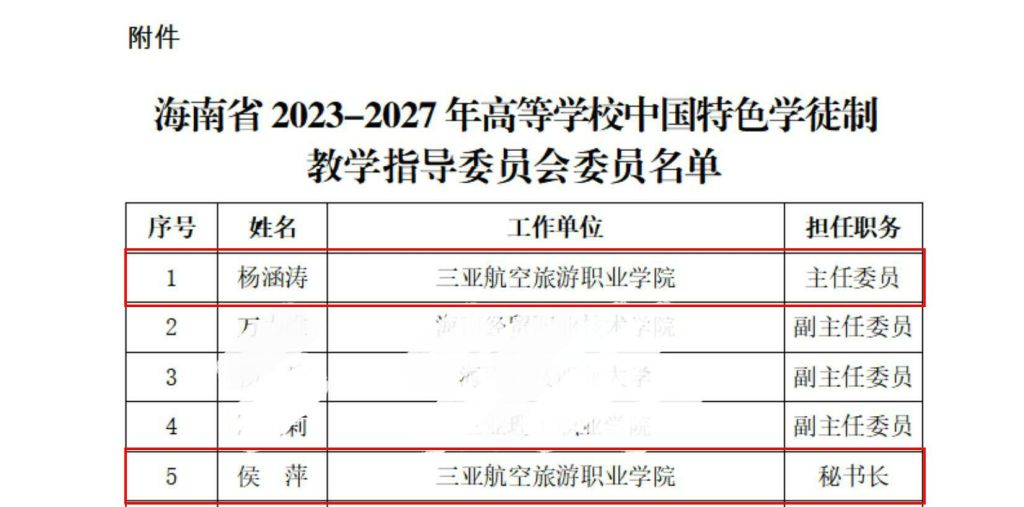 2023年3月13日,海南省教育厅下发文件《关于成立海南省2023—2027年高等学校中国特色学徒制教学指导委员会的通知》(琼教高〔2023〕15号),我校当选主任委员单位,我校党委书记、董事长兼校长杨涵涛任主任委员,国际旅游学院院长侯萍任秘书长。