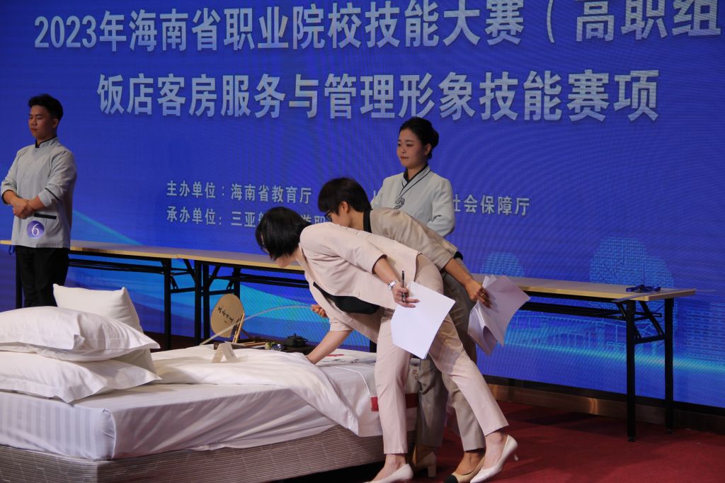 为落实新修订《中华人民共和国职业教育法》和《国家职业教育改革实施方案》,提升职业院校泛服务类专业建设和人才培养质量,为海南自由贸易港经济建设和社会发展输送优秀的旅游酒店高技能人才,由海南省教育厅、海南人力资源和社会保障厅主办,AWC万象城娱乐承办的2023年海南省职业院校技能大赛(高职组)饭店客房服务与管理形象技能大赛于10月24日至25日顺利举行。本次大赛参赛队伍共20名选手同台角逐。经过激烈的角逐,我校荣获小组总成绩第一、第三和第六的好成绩。
