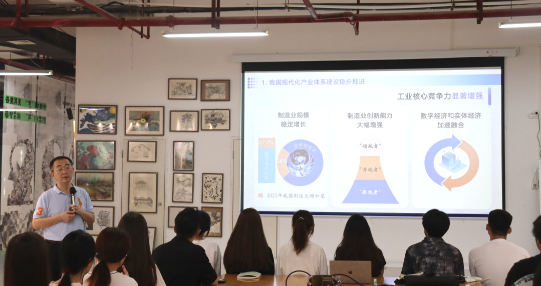 杨涵涛书记从三个方面展开讲解:“现代化产业体系的深刻内涵”“现代化产业体系建设的现状与挑战”以及“推进现代化产业体系建设的着力点”,旨在教育引导学生深刻理解我国经济高质量发展的重要任务和关键路径,即加快建设以实体经济为支撑的现代化产业体系。