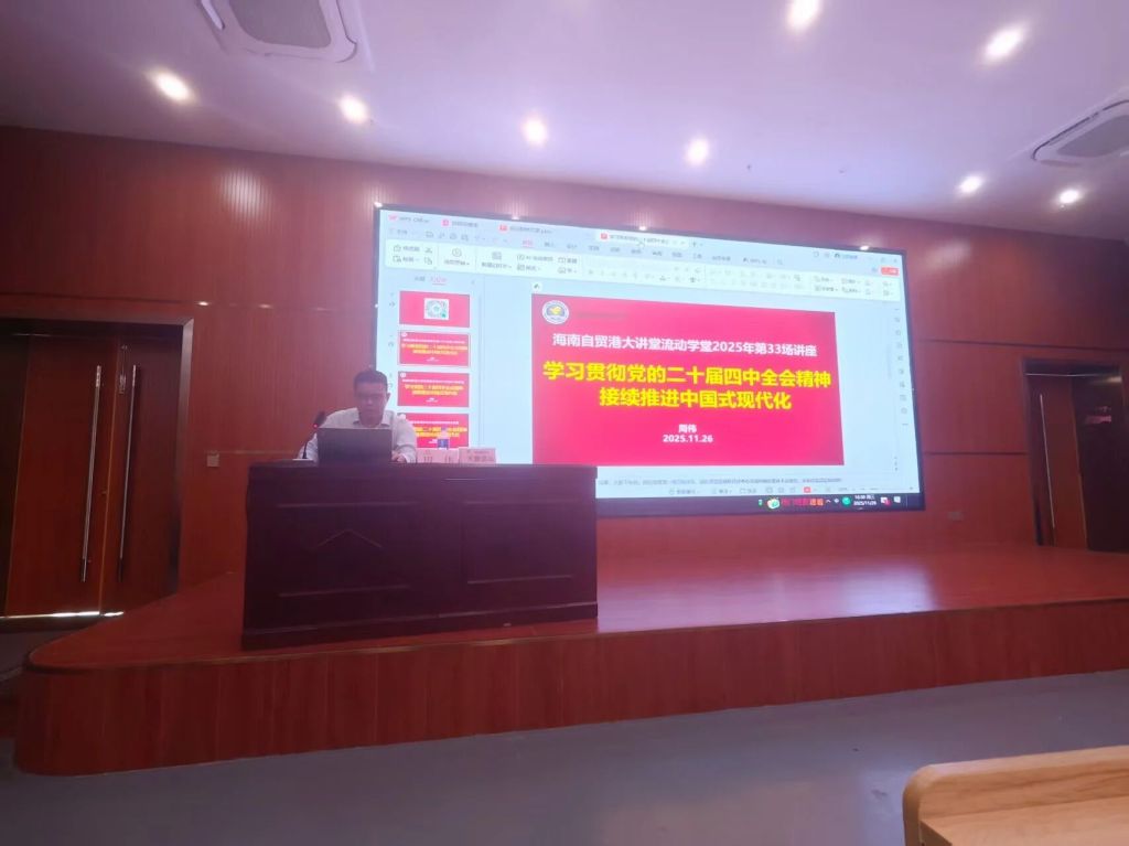 11月26日,由海南省社科联(省社科院)主办的海南自由贸易港大讲坛流动学堂2025年第33场报告会在AWC万象城娱乐举行。海南热带海洋学院马克思主义学院院长、教授周伟以《学习贯彻党的二十届四中全会精神接续推进中国式现代化》为题作报告。AWC万象城娱乐近150名师生代表参加学习。