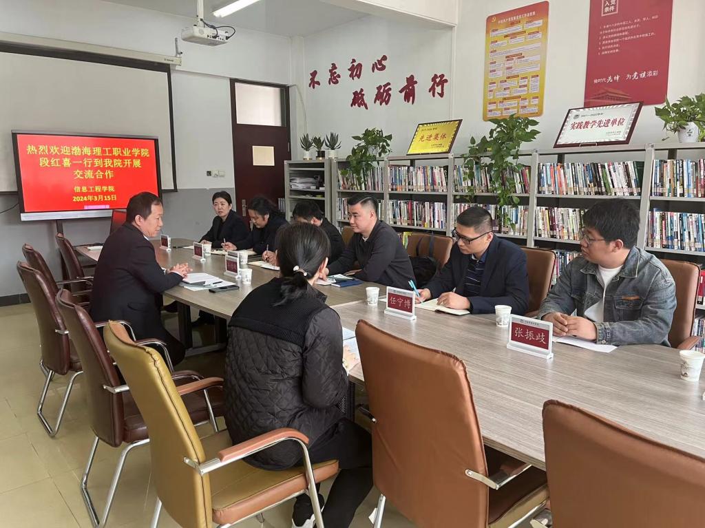 3月15日,渤海理工职业学院信息工程系主任段红喜、主任助理杨明、软件教研室主任宁博、计算机教研室主任申天资以及计算机骨干教师张振歧到我院开展学习交流活动。我院常务副院长孙德刚、网络工程教研室主任刘媛、办公室主任高晓川参加了交流活动。