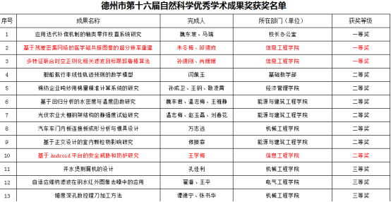 今日,中共德州市委组织部、德州市人力资源和社会保障局、德州市科学技术协会联合发布了《关于公布德州市第十六届自然科学优秀学术成果获奖名单的通知》,我院共获奖七项,其中一等奖两项、二等奖一项、三等奖四项。