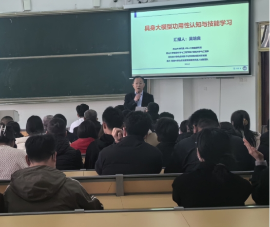吴培良教授以课题组研究成果为线索,深入讲解了具身大模型在机器人功用性认知与技能学习中的前沿应用。讲座详细剖析了大模型在机器人工具功用性认知和环境功用性认知中的关键作用,展示了机器人如何精准理解与应用工具功能,并在复杂环境中感知与适应变化。在技能学习方面,吴教授介绍了推抓、抓放及工具位姿操控等技能的最新进展,并通过案例与数据展示了显著成果。最后,展望了多模态大模型在构建更强大感知、理解和学习能力机器人中的潜力。讲座设有问答环节,老师们就具身大模型的未来发展、教育应用及工作机制等问题与吴教授进行了深入交流,收获颇丰。
