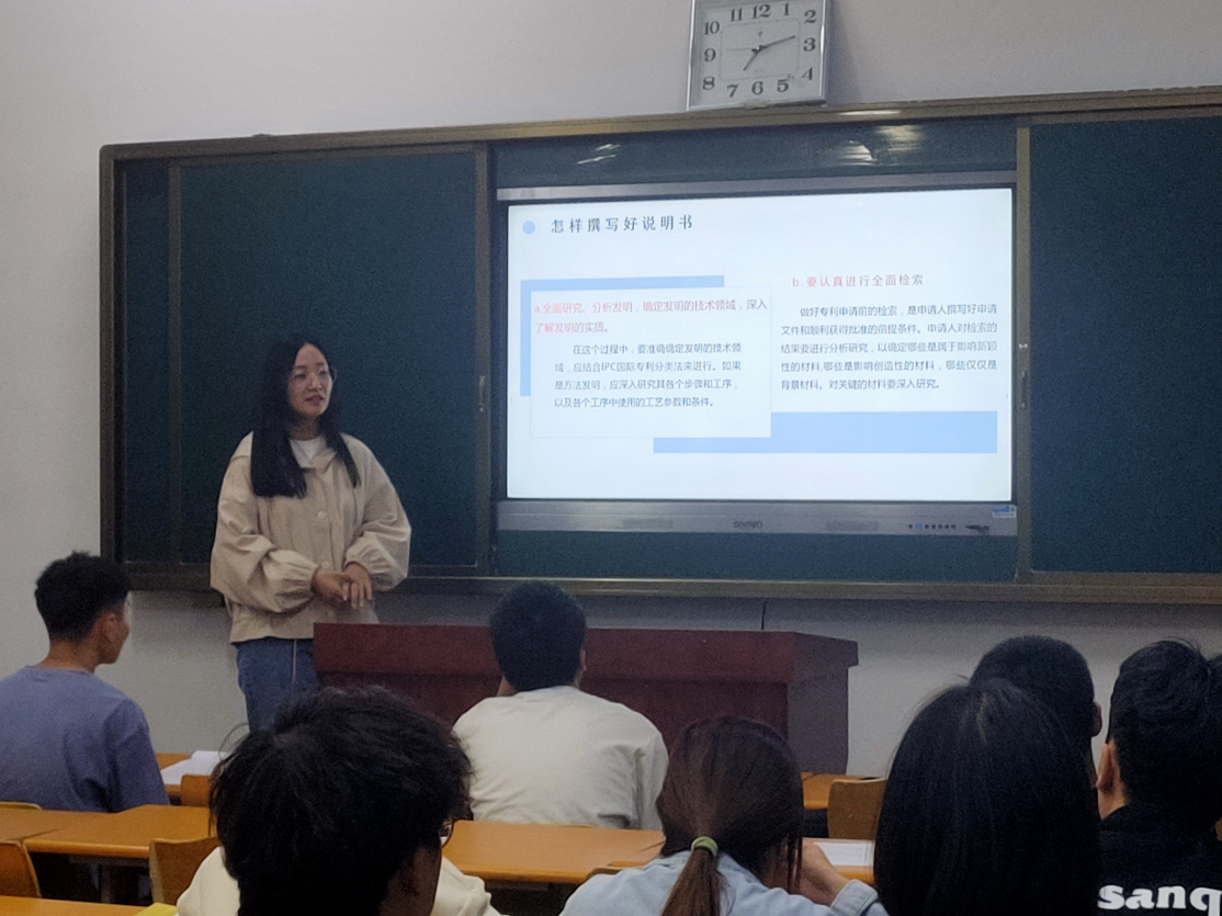 随着国家的发展,高校越来越重视思想创新,支持大学生申请专利发明。刚进入大学的同学,他们对于专利是什么还不是很了解,所以对于专利说明书的撰写进行讲解是一件必要的事情。“全心全意为同学服务”是我们的宗旨,为同学们解除疑惑是我们应有的责任。大家在听讲解的过程中非常认真,能够积极进行互动,老师也很支持这种活动的推广。尽管在对于专利撰写这方面充满迷茫,但大家对于挑战的热情不减,在讲解结束后一个个摩拳擦掌积极加入专利申请的大军中。
