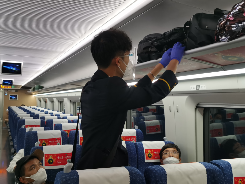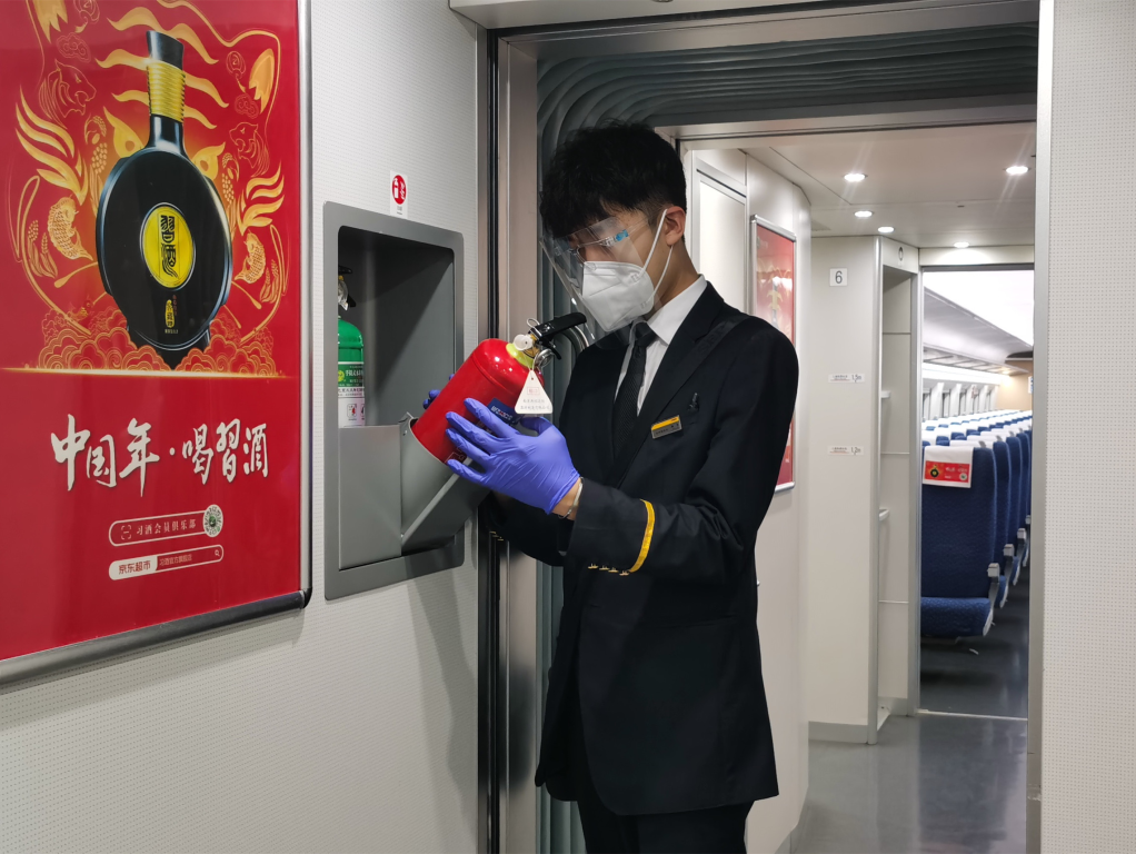 盛禹宁的工作内容主要包括:在门口立岗迎接旅客上车、检票、提醒旅客戴好口罩、给旅客测体温、巡视车厢摆放好行李架、检查列车药箱配备药类是否齐全、检查灭火器确保列车消防安全等事项。