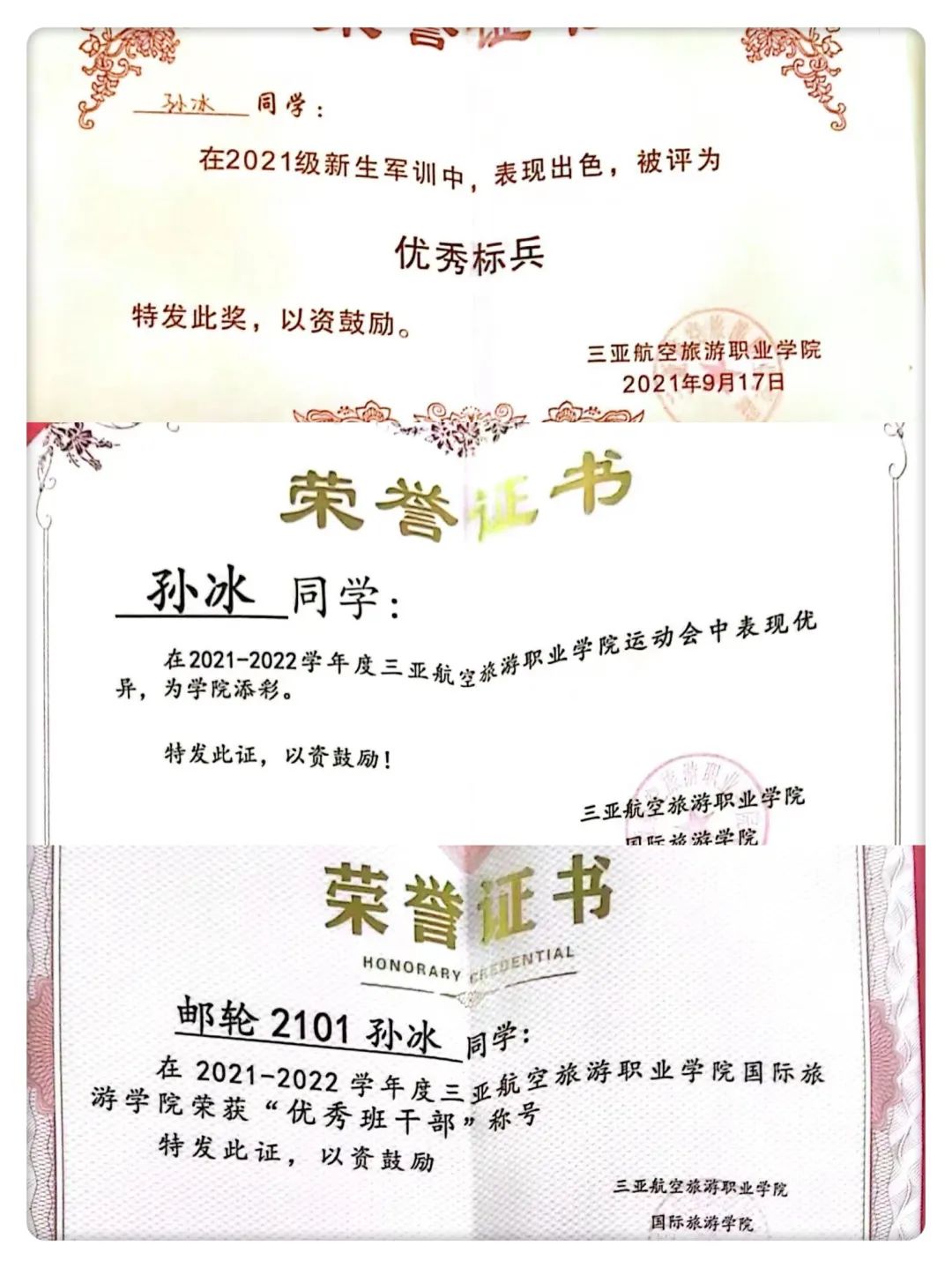 孙冰自入学后的第一个星期,当同学们还沉浸在刚入学的兴奋之中,流连于南国的美景时,孙冰毛遂自荐做了班长,承担起了班级统筹和管理工作。他始终是辅导员和任课老师得力的助手,获得院系老师们的一致好评,并在大一时荣获“优秀班干部”。此外,他还积极参加学校组织的各项活动,军训期间凭借吃苦耐劳的精神和踏实有序的态度,被评为“优秀标兵”。2021年校运动会赛场上,孙冰也凭借自己良好的身体素质,驰骋赛场,获得运动会二百米亚军和“精神文明奖”。不啻微芒,造炬成阳。一项项奖项的背后,凝聚着满腔的热忱和不懈的努力。