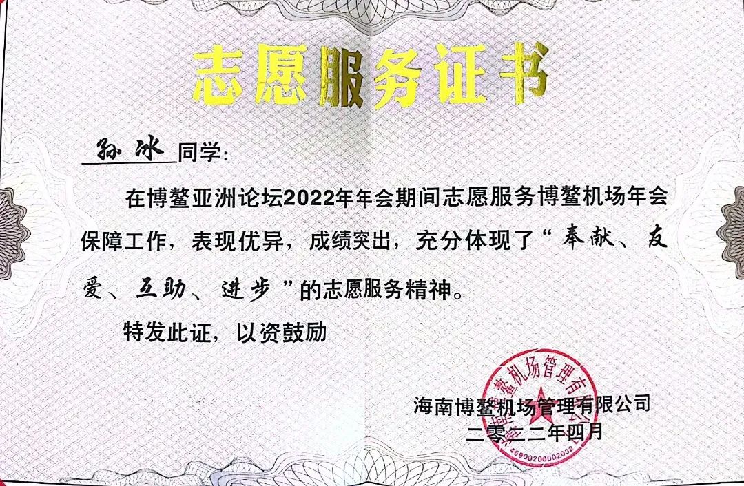 博鳌亚洲论坛的如期圆满落幕,离不开每一位为其付出辛苦的平凡工作者,为嘉奖孙冰同学在博鳌机场中不辞辛苦、勤勤恳恳工作态度和敬业精神,博鳌机场领导为他发放优秀志愿者证书,并以此激励他在今后的学习与工作中始终保持这种敬业精神。相信他会在今后的人生道路会越来越广阔,人生就要不负青春、不负自己。