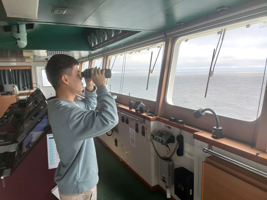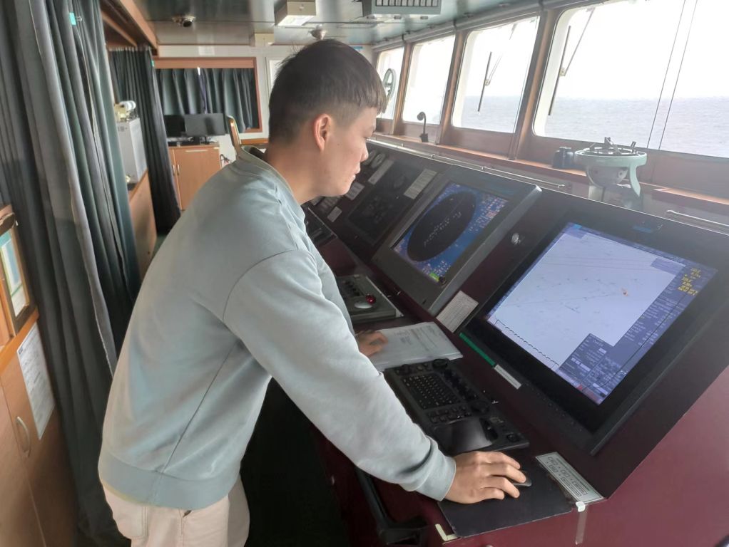 在“CL EDI”(艾迪)轮上实习期间,覃学山学到了很多。刚上船时,他便在驾驶台上进行了操舵练习。掌握该船舵效后,他又学习了如何使用电罗经,GPS,测深仪,雷达,电子海图等航海仪器,交通密度比较大时学习实践中是如何避碰,如何呼叫他船以及回应他船。夜晚时他还会看看附近他船的号灯,是否与教材上所教的号灯一致。