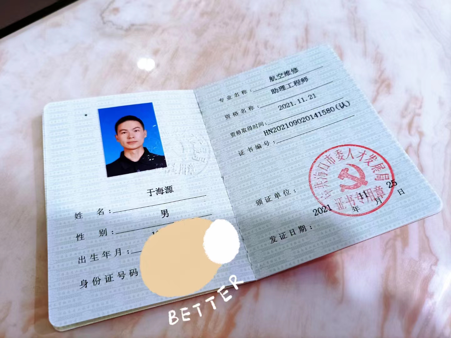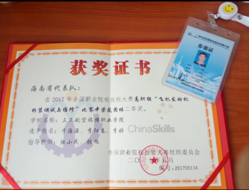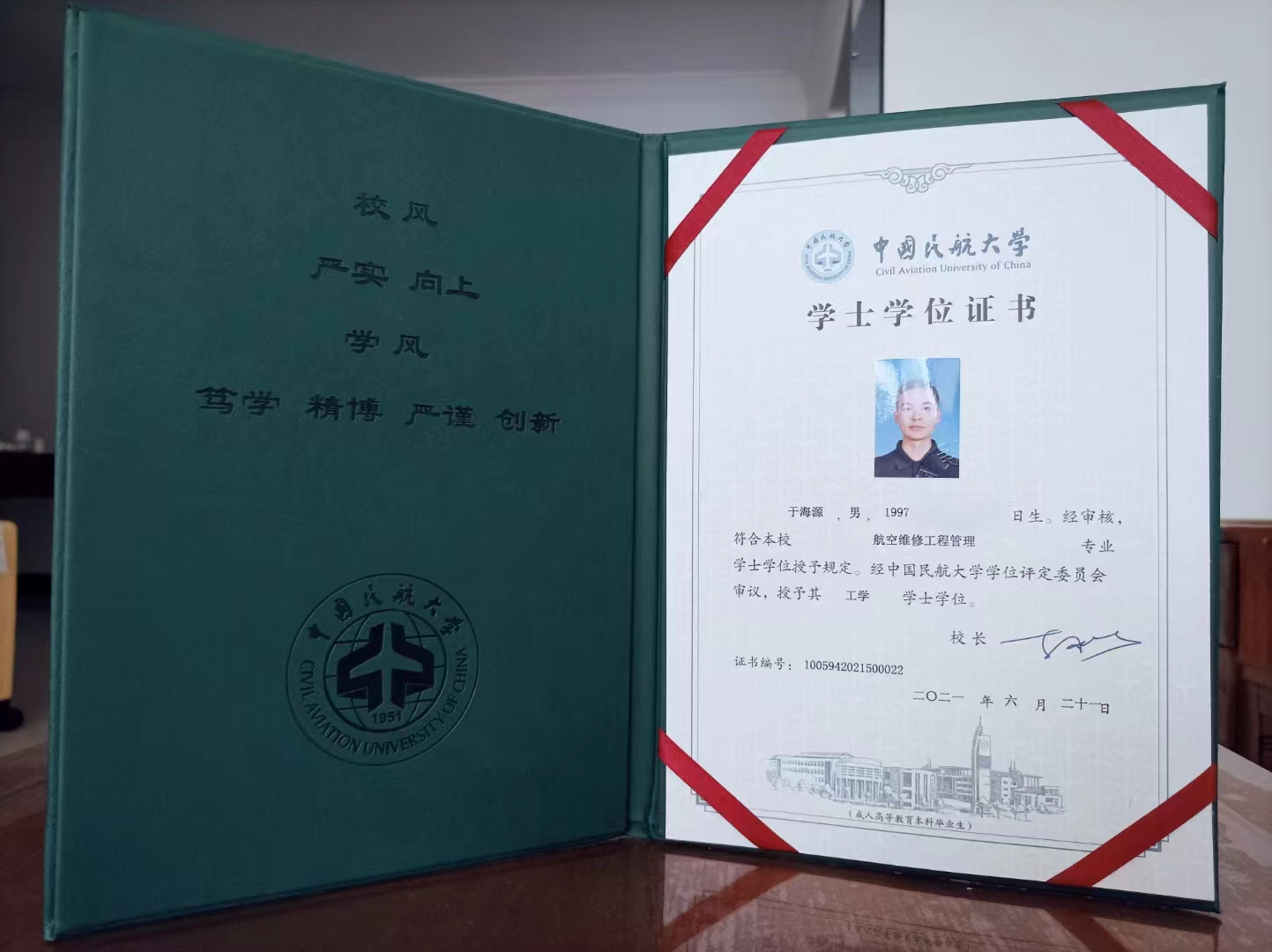 认识于海源的人都知道,他是一个有计划且执行力很强的人,从一入学他便明确了目标,做好了自己的职业生涯规划。在近三年的大学生活中,于海源在各方面严格要求自己,尤其是学业方面,更是刻苦勤勉,志向高远。在校期间他曾获得2016-2017年度国家奖学金及2015-2016学年度国家励志奖学金;在全国职业院校技能大赛高职组“飞机发动机拆装调试与维修”比赛中荣获团队二等奖。除此之外,于海源还积极参与学校专升本培训,并通过自己的不懈努力,刻苦自学,于2018年考上了中国民航大学航空维修工程管理专业,并于2020年顺利取得学士学位证;2021年考取航空维修助理工程师资格证。