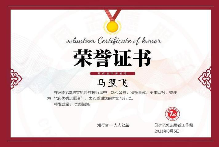 马翌飞同学多次担任志愿者,曾在郑州“720暴雨”灾害中冲锋在前,获得“720优秀志愿者称号”,多次参与新冠疫情防控志愿者工作。